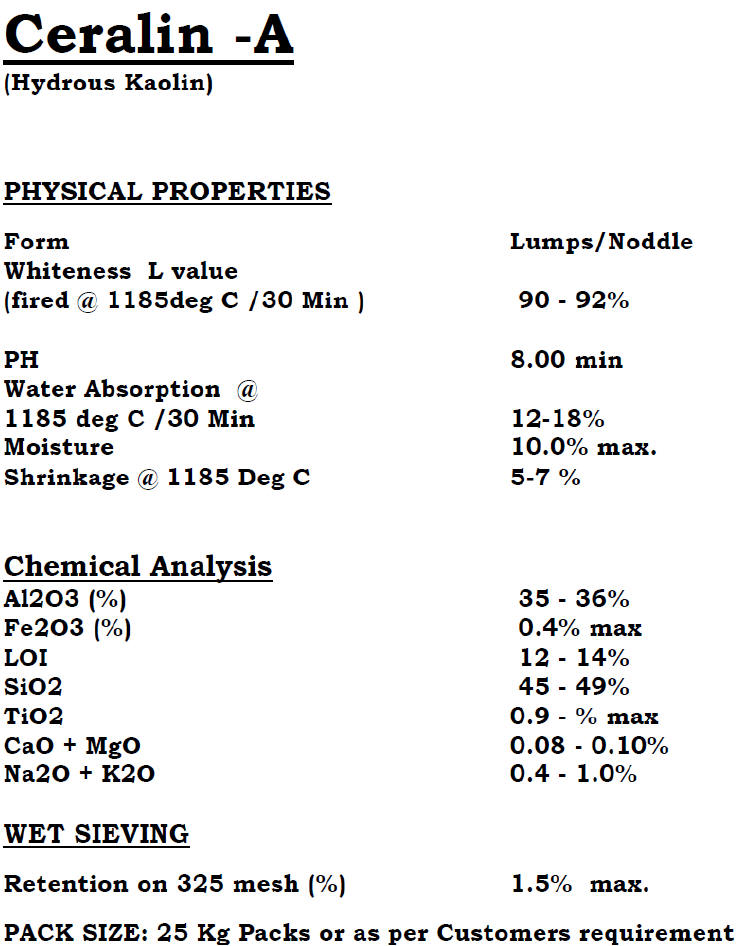 Ceralin-A is high quality treated hydrous kaolin marked with high whiteness after firing in addition to remarkable watermark effect.